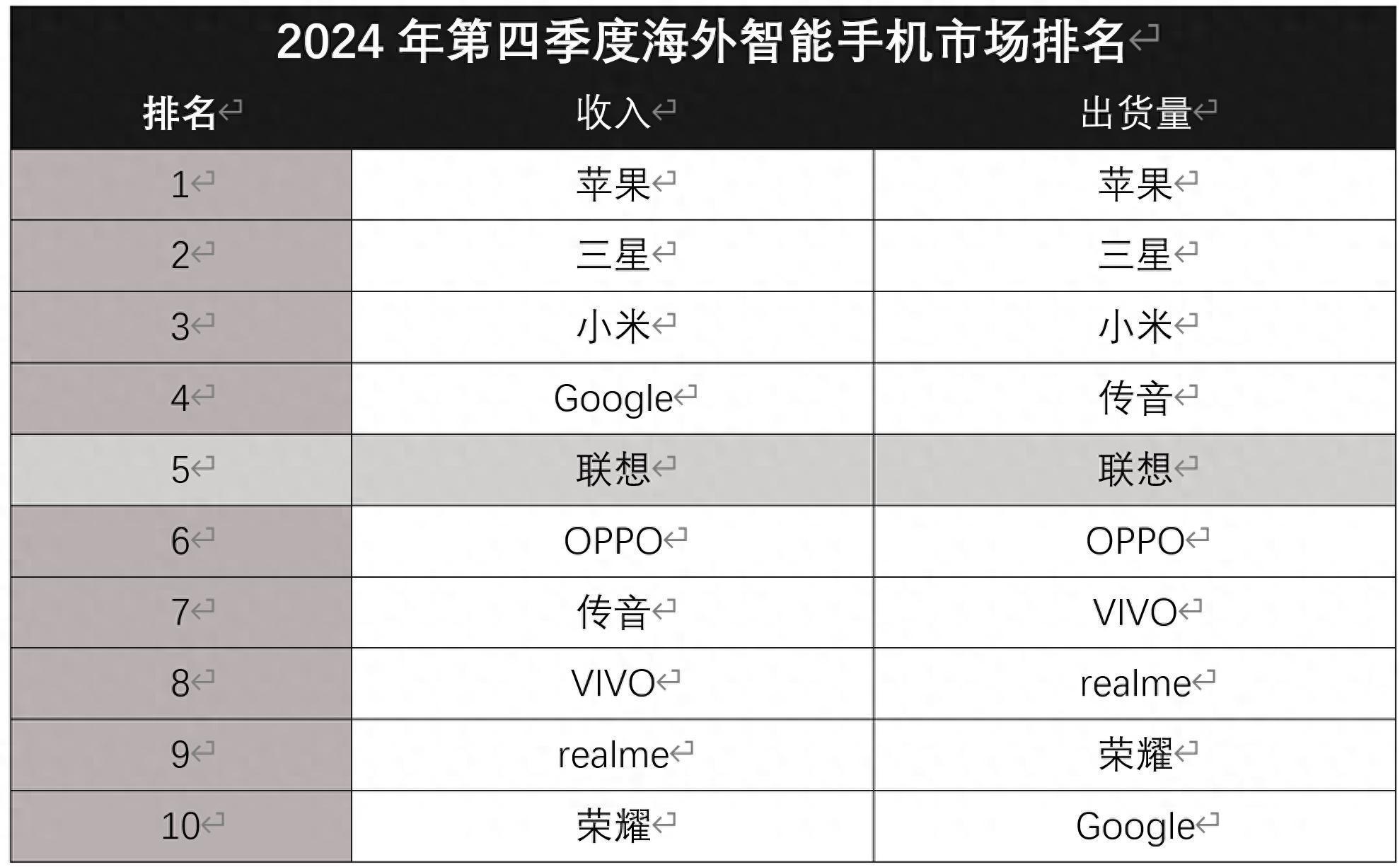IDC数据显示,2024年第四季度,尽管全球智能手机市场面临挑战,但联想手机在海外市场依然保持了稳健的增长态势。在收入方面,联想手机同比增长10.6%,排名第五,在出货量方面,也以15%的同比增长排名第五。